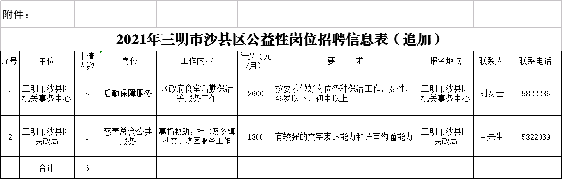 2021-10-16 10:30:09閱讀()三明市沙縣區(qū)人民政府根據(jù)《沙縣人民政府關(guān)于設(shè)置公益性崗位的實(shí)施意見》(沙政〔2017〕42號(hào))及《沙縣人力資源和社會(huì)保障局關(guān)于進(jìn)一步做好2021年公益性崗位申報(bào)和加強(qiáng)崗位管理工作的通知》(沙人社〔2020〕103號(hào))文件精神,我區(qū)機(jī)關(guān)事務(wù)中心、民政局追加6個(gè)公益性崗位,經(jīng)區(qū)財(cái)政局、人社局審批,同意三明市沙縣區(qū)機(jī)關(guān)事務(wù)中心2個(gè)單位招聘公益性崗位6名(見附件),請(qǐng)有就業(yè)意向的就業(yè)困難人員持《就業(yè)創(chuàng)業(yè)證》或《就業(yè)失業(yè)登記證》到相關(guān)單位報(bào)名。