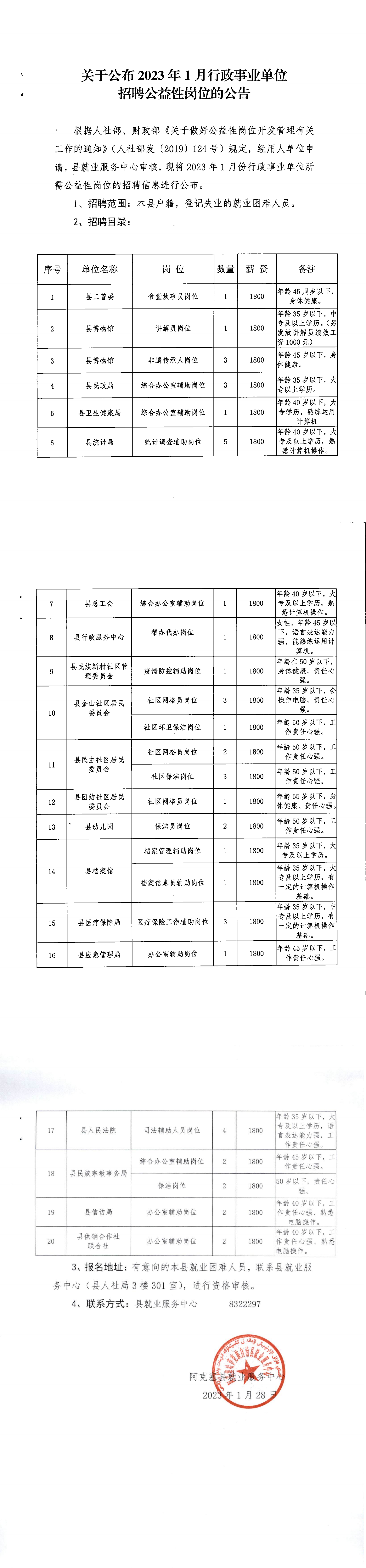 2023-01-31 17:04:23閱讀()酒泉市阿克塞人民政府根據(jù)人社部、財政部《關(guān)于做好公益性崗位開發(fā)管理有關(guān)工作的通知》(人社部發(fā) (2019) 124號)規(guī)定,經(jīng)用人單位申請,縣就業(yè)服務(wù)中心審核,現(xiàn)將 2023 年 1月份行政事業(yè)單位所需公益性崗位的招聘信息進行公布。