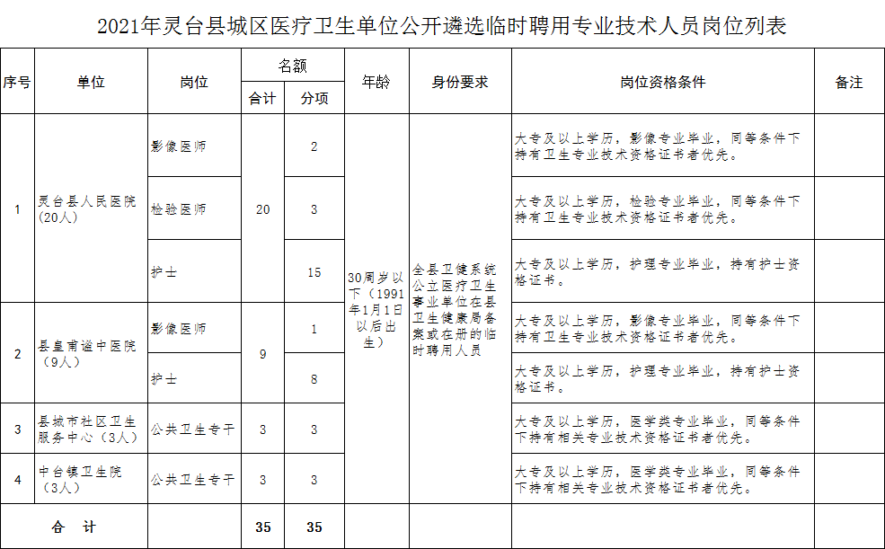 具體詳見《2021年靈臺縣城區(qū)醫(yī)療衛(wèi)生單位公開遴選臨時聘用專業(yè)技術(shù)人員崗位列表》。