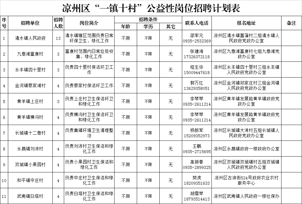 2.報(bào)名地點(diǎn):詳見《涼州區(qū)“一鎮(zhèn)十村”公益性崗位招聘計(jì)劃表》;