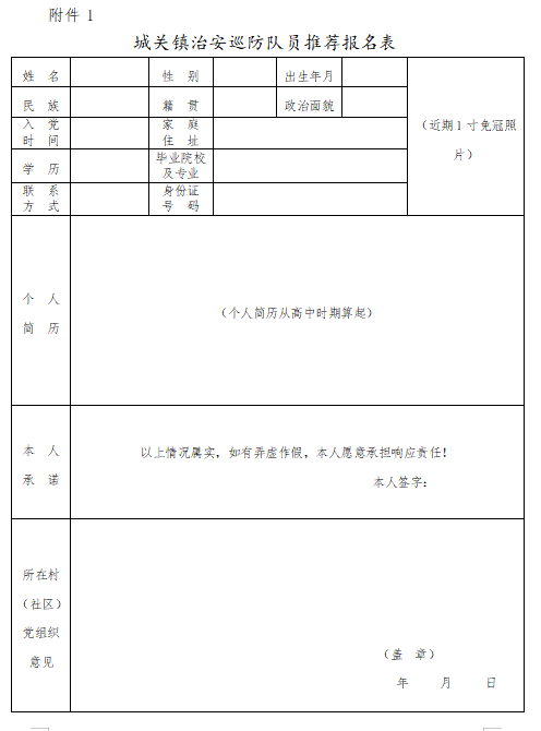 附件1:《城關(guān)鎮(zhèn)治安巡防隊(duì)員推薦報名表》