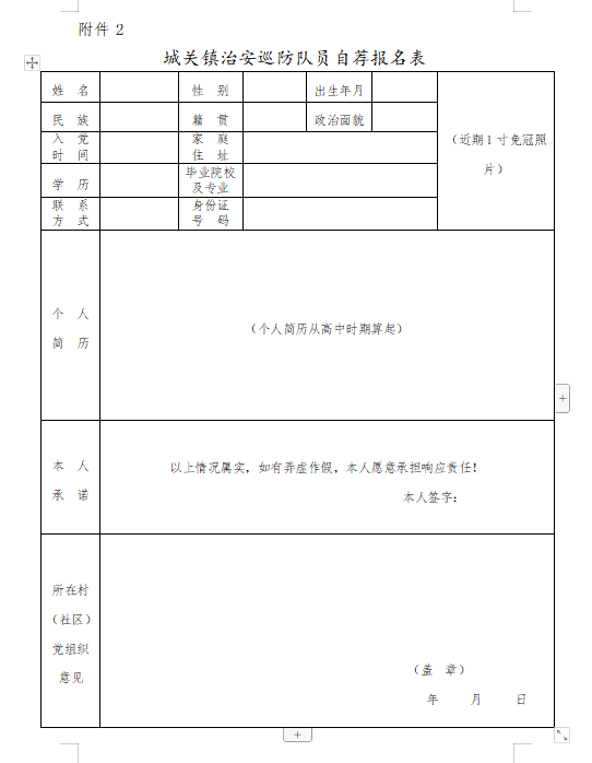 附件2:《城關(guān)鎮(zhèn)治安巡防隊(duì)員自薦報名表》