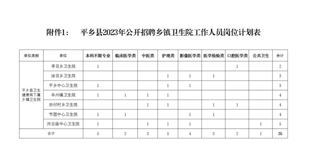 公開(kāi)招聘鄉(xiāng)鎮(zhèn)衛(wèi)生院工作人員25名。其中:管理崗5名,專技崗20名。詳見(jiàn)《平鄉(xiāng)縣2023年公開(kāi)招聘鄉(xiāng)鎮(zhèn)衛(wèi)生院工作人員崗位計(jì)劃表》(附件1),《平鄉(xiāng)縣2023年公開(kāi)招聘鄉(xiāng)鎮(zhèn)衛(wèi)生院工作人員崗位信息表》(附件2)。