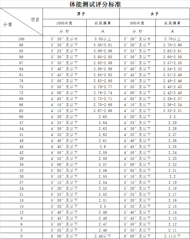 體能測試成績滿分100分。體能測試包括兩個項目:男子1000米跑、女子800米跑和縱跳摸高,每項滿分為100分。測試后,按照兩項各占50%的比例合成體能測試成績。體能測試成績滿60分即為合格,不合格不可參加后續(xù)環(huán)節(jié)。項目及評分標(biāo)準(zhǔn)如下: