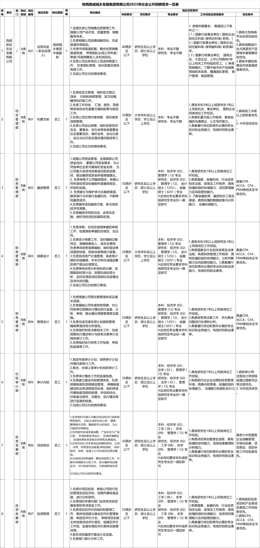 本次招聘共涉及西咸城鄉(xiāng)集團本級及子公司17個崗位共計25名人員。具體崗位職責及崗位任職條件詳見《西咸城鄉(xiāng)集團2023年社會公開招聘需求一覽表》。