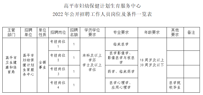 附件:高平市婦幼保健計(jì)劃生育服務(wù)中心2022年公開(kāi)招聘工作人員崗位及條件一覽表