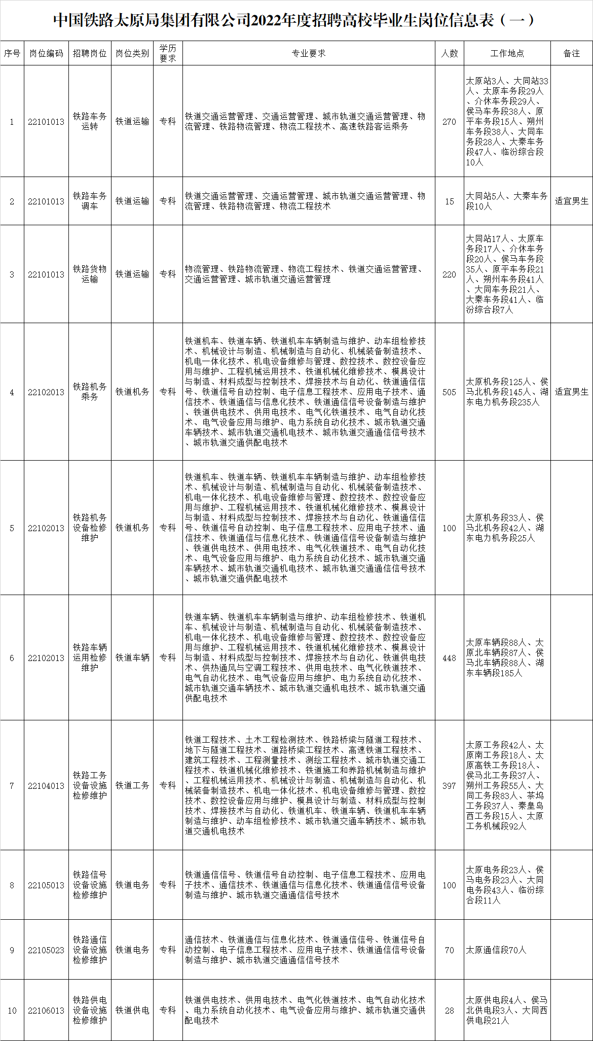 招聘崗位、學(xué)歷、專業(yè)、人數(shù)和工作地點等內(nèi)容詳見《中國鐵路太原局集團(tuán)有限公司2022年度招聘高校畢業(yè)生崗位信息表(一)》。