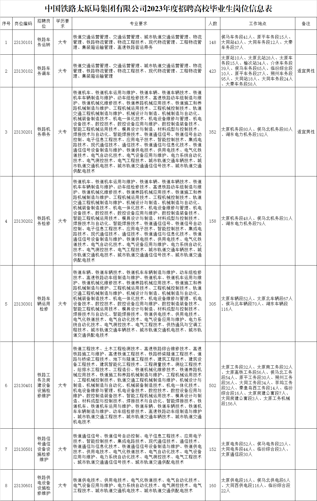 2022-11-30 22:02:02閱讀()中國鐵路太原局集團(tuán)有限公司根據(jù)企業(yè)發(fā)展需要,現(xiàn)將2023年全日制普通高等職業(yè)院校高職(大專)畢業(yè)生招聘有關(guān)事項公告如下: