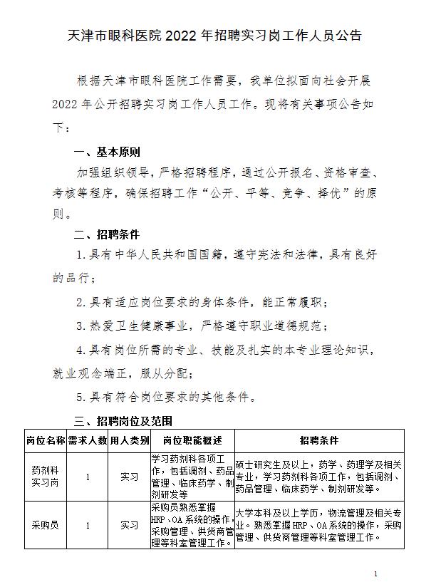 2022年天津市眼科醫(yī)院招聘實習崗工作人員公告