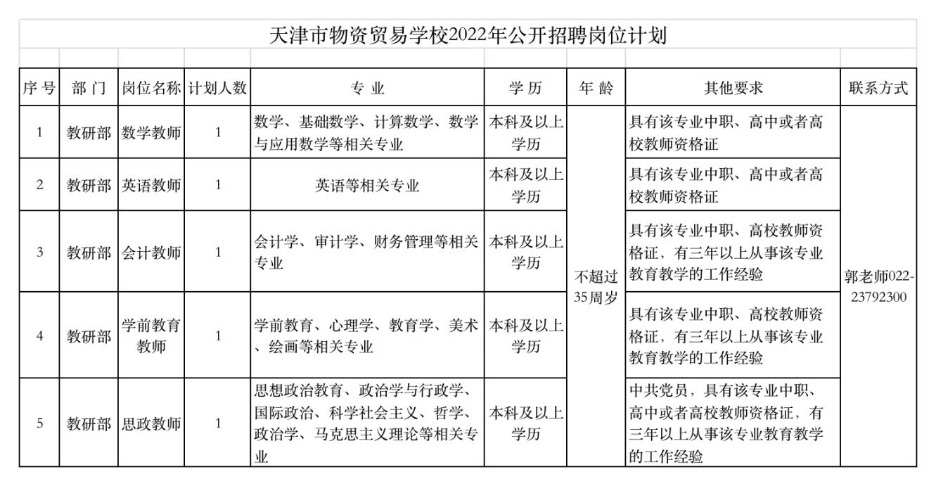 具體招聘崗位見《天津市物資貿(mào)易學(xué)校2022年公開招聘崗位計(jì)劃》。