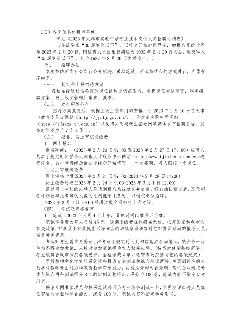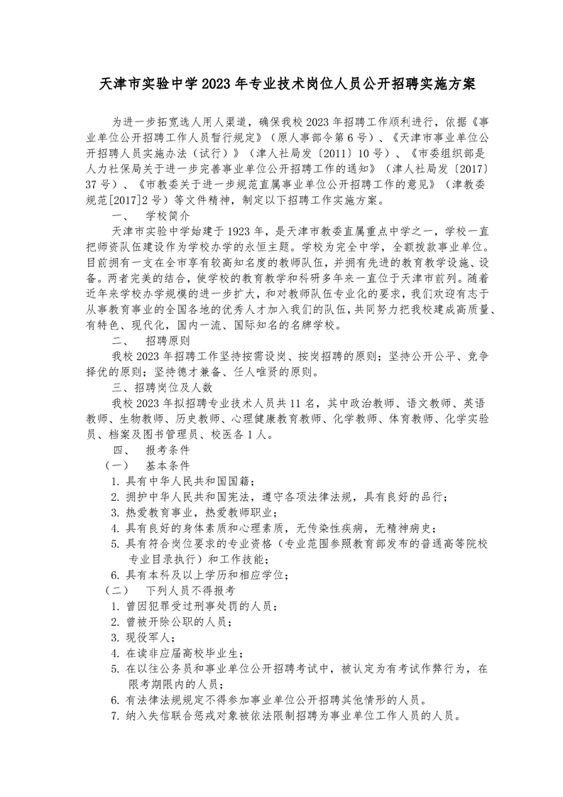 2023年天津市實(shí)驗(yàn)中學(xué)專業(yè)技術(shù)崗位人員公開招聘實(shí)施方案
