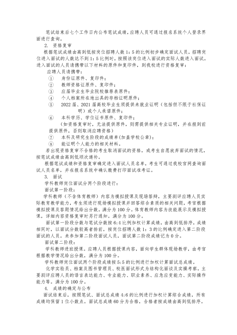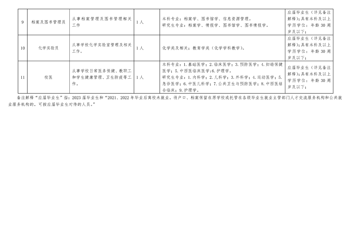 三、招聘崗位及人數(shù)我校 2023 年擬招聘專業(yè)技術(shù)人員共 11 名,其中政治教師、語文教師、英語教師、生物教師、歷史教師、心理健康教育教師、化學(xué)教師、體育教師、化學(xué)實(shí)驗(yàn)員、檔案及圖書管理員、校醫(yī)各 1人。