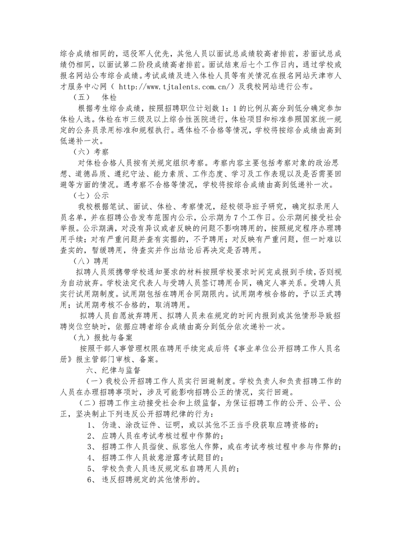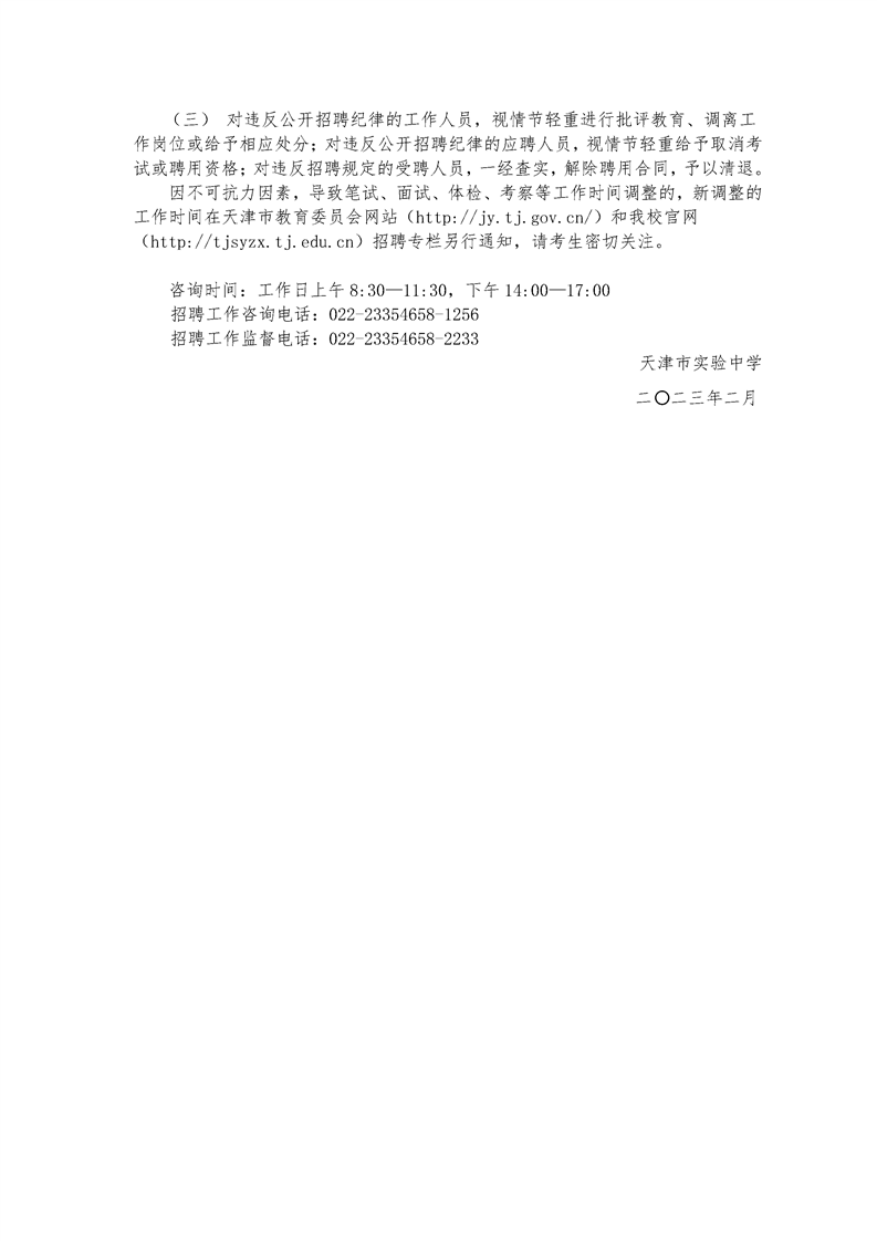 2023-02-11 16:34:25閱讀()天津市實(shí)驗(yàn)中學(xué)為進(jìn)一步拓寬選人用人渠道,確保我校 2023 年招聘工作順利進(jìn)行,依據(jù)《事業(yè)單位公開招聘工作人員暫行規(guī)定》(原人事部令第 6 號(hào))、《天津市事業(yè)單位公開招聘人員實(shí)施辦法(試行)》 津人社局發(fā) (2011) 10 號(hào))、《市委組織部是人力社保局關(guān)于進(jìn)一步完善事業(yè)單位公開招聘工作的通知》 (津人社局發(fā) (2017)37 號(hào))、《市教委關(guān)于進(jìn)一步規(guī)范直屬事業(yè)單位公開招聘工作的意見》 (津教委規(guī)范[2017]2 號(hào))等文件精神,制定以下招聘工作實(shí)施方案。
