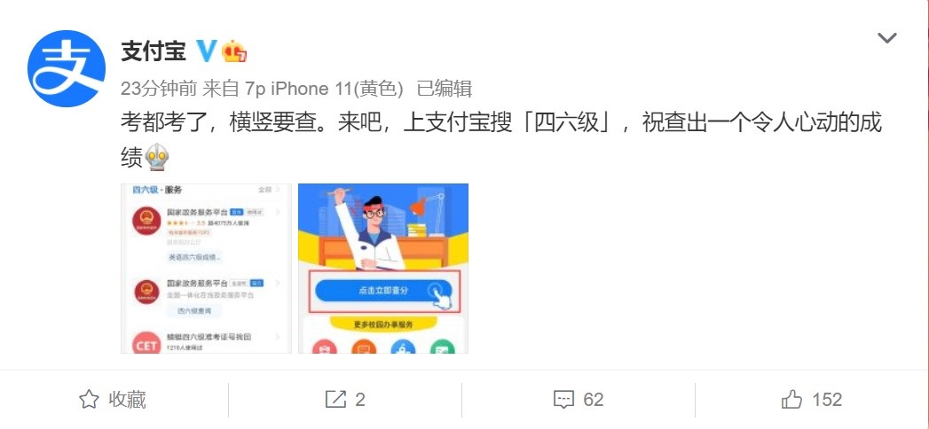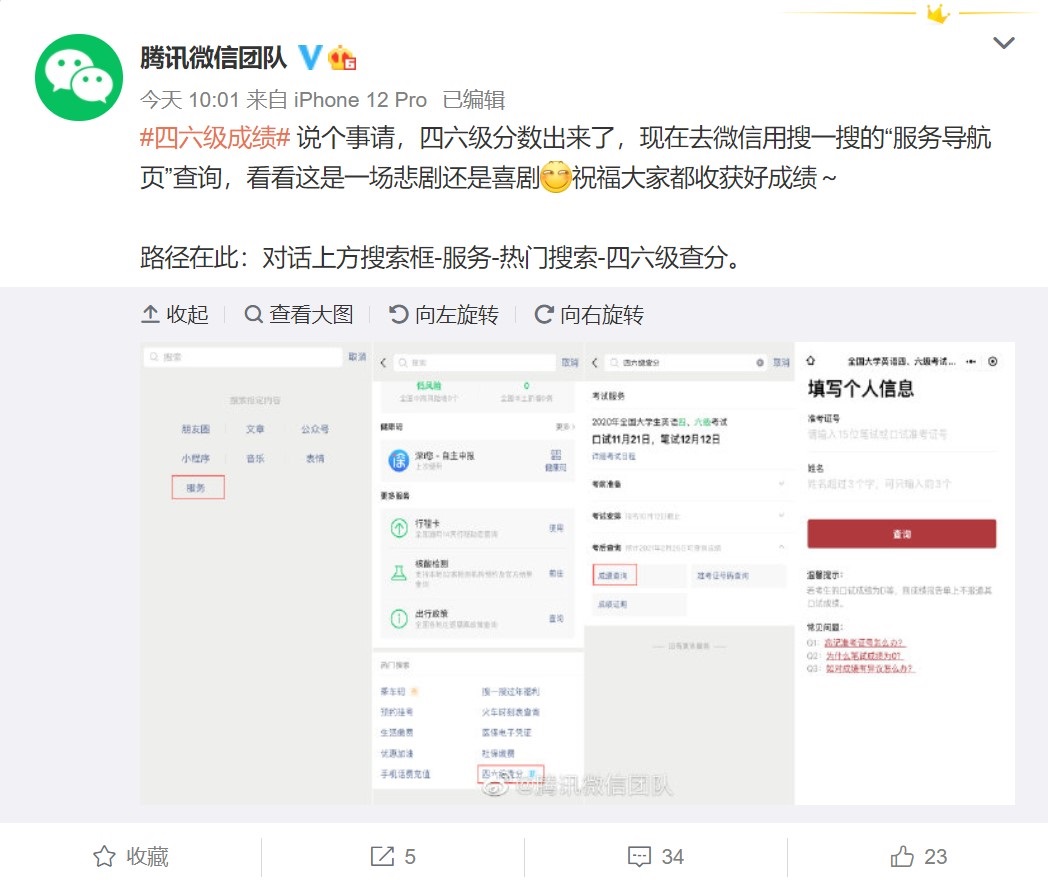 今日午間,@支付寶 微博發(fā)文稱,用戶可通過支付寶搜索 “四六級”查分。26日上午,微信也發(fā)布消息稱,微信搜一搜聯(lián)合國家政務服務平臺為廣大考生提供四六級成績查詢服務。屆時,廣大考生可通過微信搜一搜進行四六級查分,具體路徑為:對話上方搜索框 - 服務 - 熱門搜索 - 四六級查分。