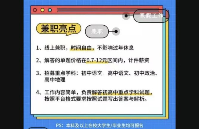 她的說(shuō)法也在部分在線教育、“拍題”平臺(tái)的答主招募宣傳上得到了印證。懂懂筆記發(fā)現(xiàn),部分兼職答主的招募廣告上都表示,只要本科以上學(xué)歷即可報(bào)名,優(yōu)秀的應(yīng)屆畢業(yè)生也可以在線兼職。