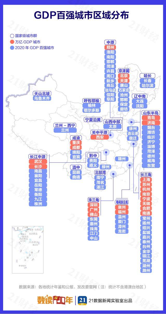 21數(shù)據(jù)新聞實驗室注意到,除了江蘇的徐州、連云港、宿遷,廣西柳州及江西贛州外,其他GDP百強城市均地處上述19大國家級城市群,其中長三角擁有20座GDP百強城市、8座GDP萬億城市,數(shù)量上占據(jù)絕對優(yōu)勢。