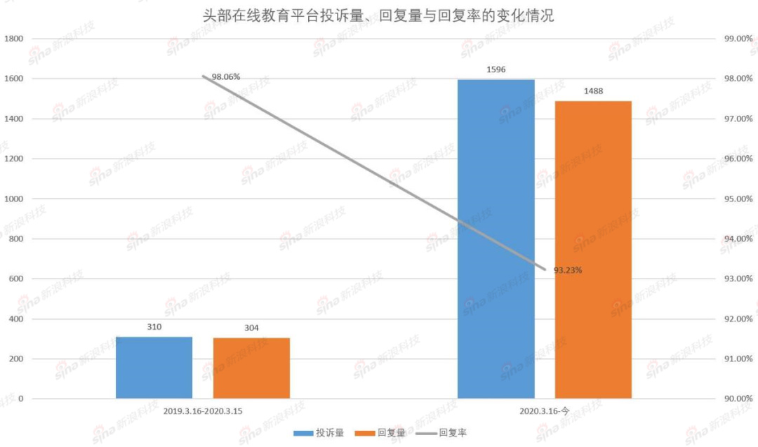 消費者服務平臺黑貓獲取的數(shù)據(jù)顯示,在教培領域的5家頭部平臺(好未來、作業(yè)幫、猿輔導、跟誰學、VIPKID)中,從2019年3月16日到2020年3月15日產生的投訴總量為310起,而2020年3月16日至今則為1596起,增長了414.84%。