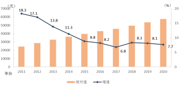 2011-2020年城鎮(zhèn)非私營(yíng)單位就業(yè)人員年平均工資及增速