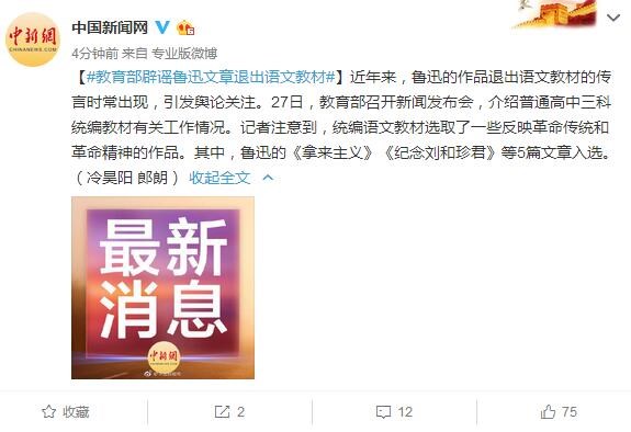今天,教育部召開(kāi)新聞發(fā)布會(huì),介紹了普通高中三科統(tǒng)編教材有關(guān)工作情況。魯迅的作品退出語(yǔ)文教材的傳言引發(fā)了輿論關(guān)注,而教育部對(duì)此進(jìn)行了 ...