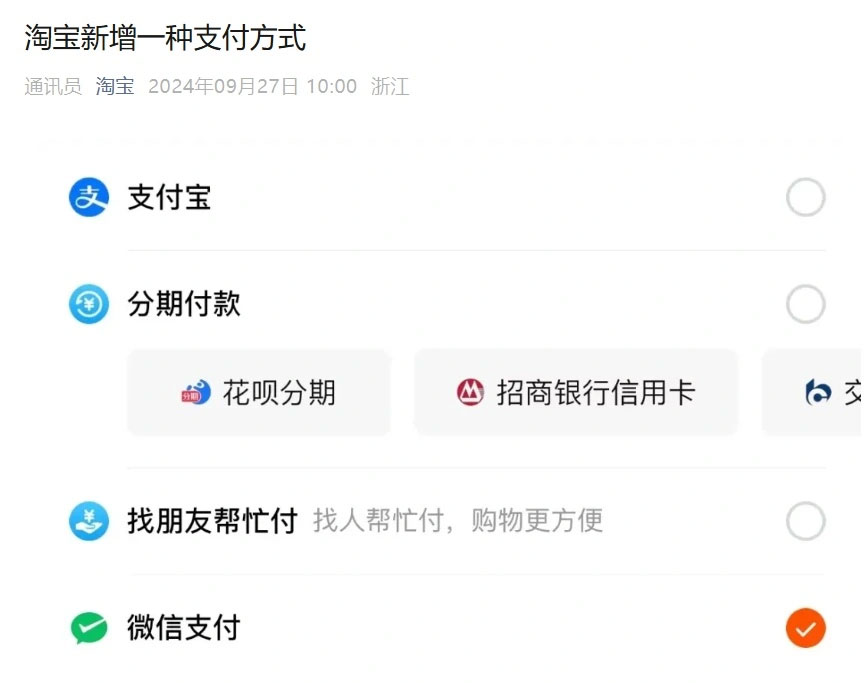 淘寶官宣:今日起在淘寶付款時(shí)可用微信支付