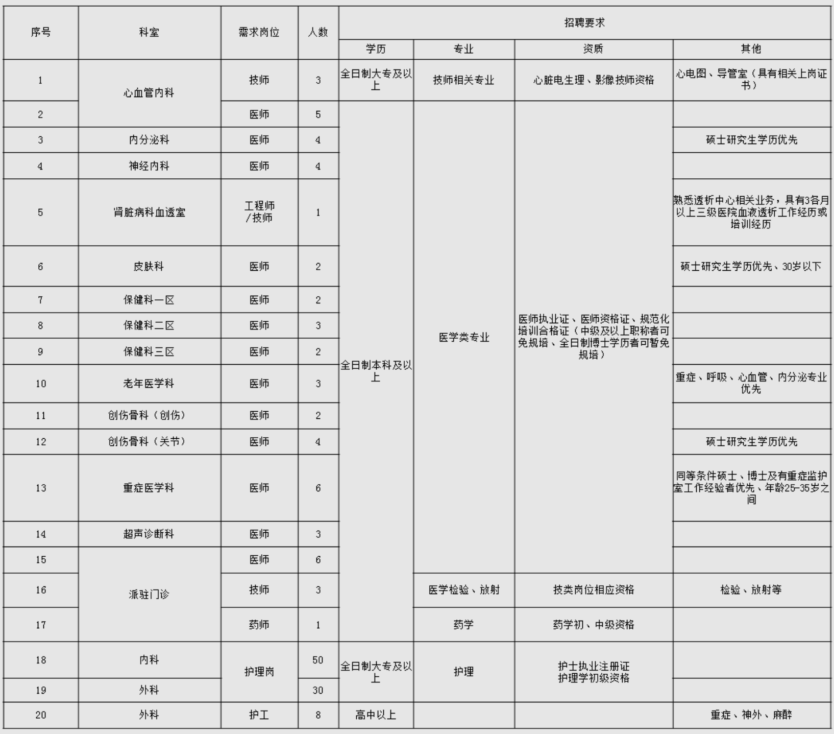 根據(jù)醫(yī)院發(fā)展需要,現(xiàn)面向社會(huì)招聘醫(yī)、藥、護(hù)、技、工程等類別人員,有臨床工作經(jīng)驗(yàn)者優(yōu)先。