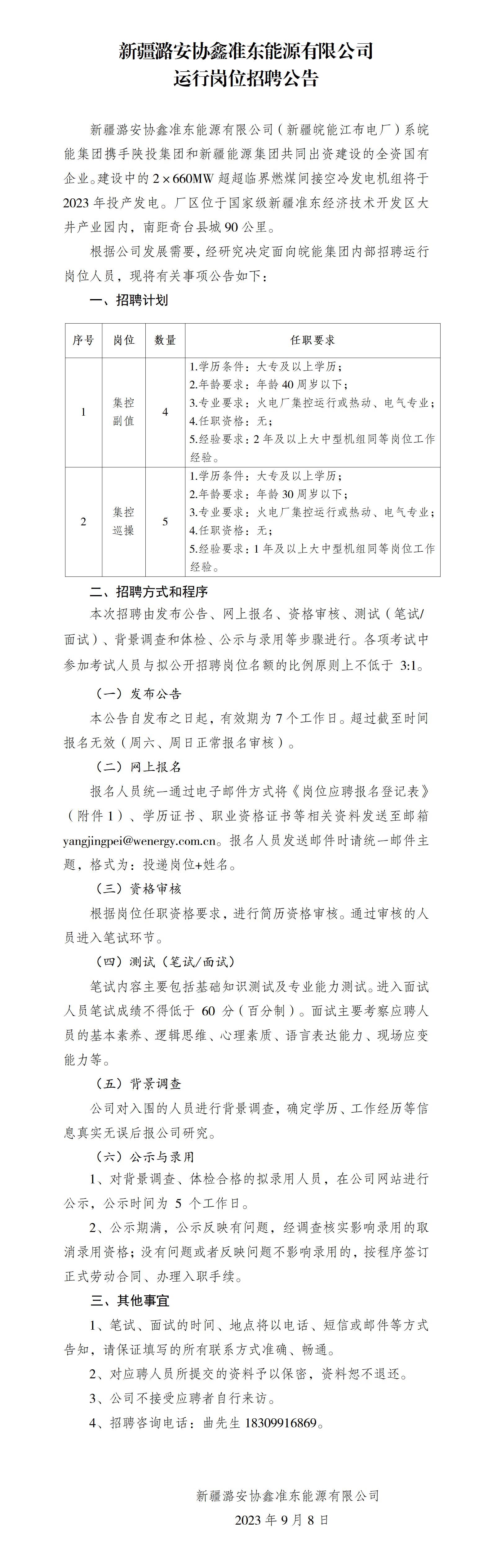 根據(jù)公司發(fā)展需要,經(jīng)研究決定面向皖能集團(tuán)內(nèi)部招聘運行崗位人員,現(xiàn)將有關(guān)事項公告如下: