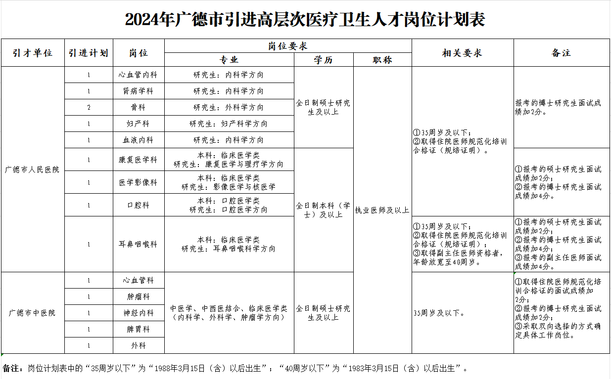 具體要求詳見附件1(《2024年廣德市引進高層次醫(yī)療衛(wèi)生人才崗位計劃表》)。