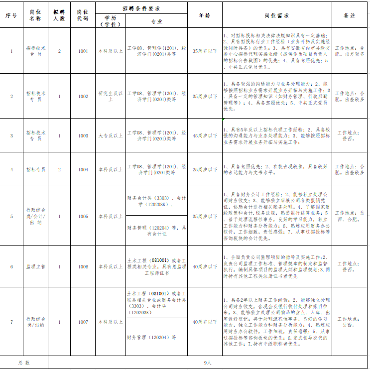 1.崗位需求:招聘人數(shù)共計9人,具體招聘崗位詳見附件1:《安徽皖岳信合項目管理有限公司2024年公開招聘崗位需求表》。