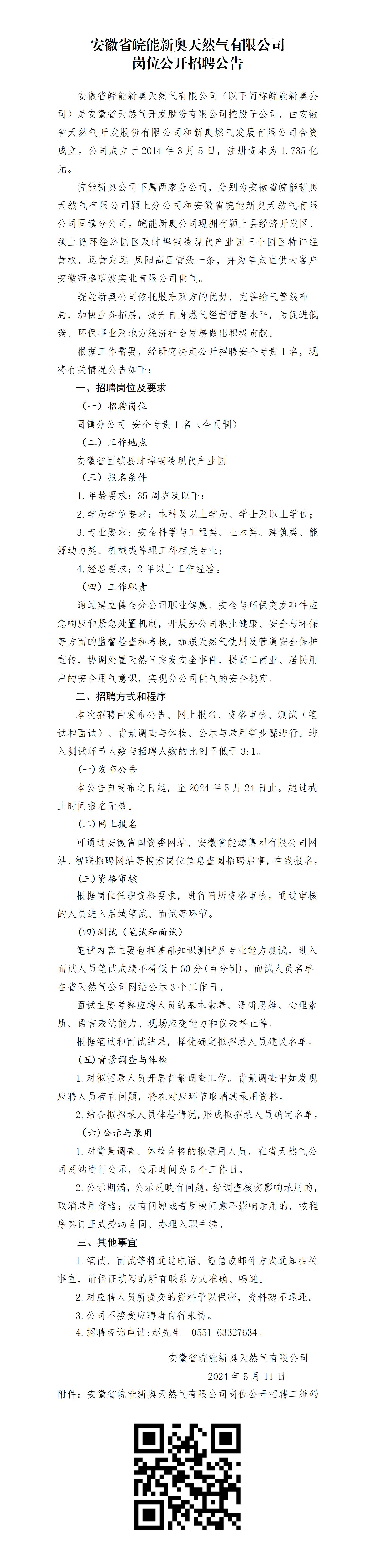 2024年安徽省皖能新奧天然氣有限公司崗位公開招聘公告