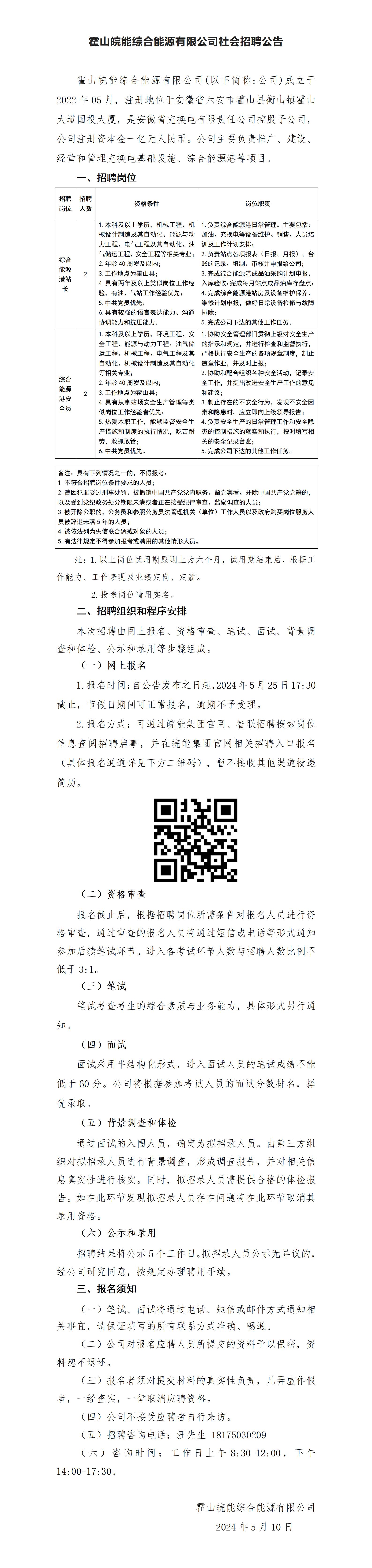 2024年六安霍山皖能綜合能源有限公司社會招聘公告