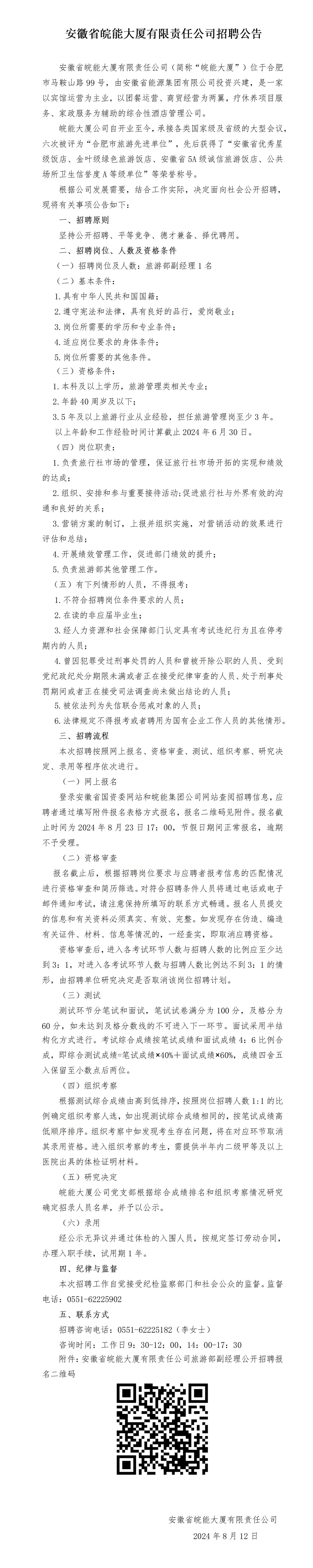 2024年安徽省皖能大廈有限責任公司招聘公告