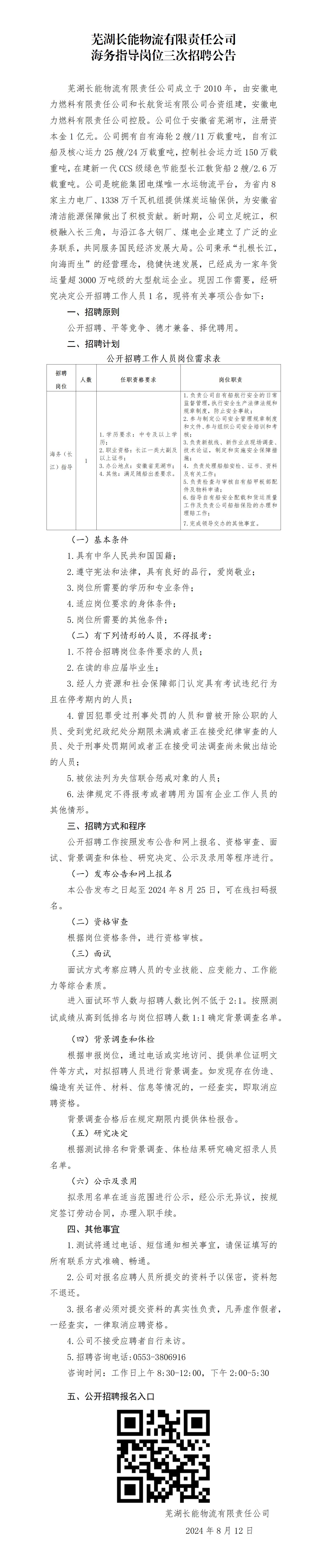 2024年蕪湖長能物流有限責(zé)任公司海務(wù)指導(dǎo)崗位三次招聘公告