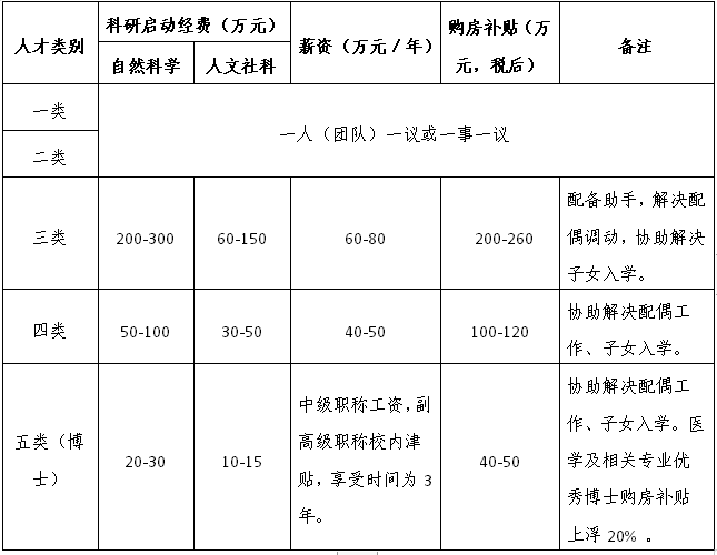 1.對(duì)于全職引進(jìn)的博士及以上高層次人才,入周轉(zhuǎn)池編制,按照《皖南醫(yī)學(xué)院引進(jìn)高層次人才實(shí)施辦法(修訂)》(校政[2018]191號(hào))(http://rsc.wnmc.edu.cn/63/10/c1981a90896/page.htm)提供購房補(bǔ)貼、安家費(fèi)、科研啟動(dòng)經(jīng)費(fèi)等。標(biāo)準(zhǔn)如下: