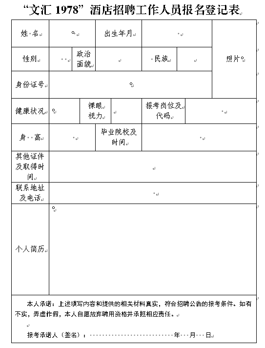 報(bào)名時(shí)提交①本人有效居民身份證、②學(xué)歷證書、③有效的無(wú)犯罪記錄證明、④各類專業(yè)證書、職稱證書的原件及填寫好的《“文匯1978”酒店招聘工作人員報(bào)名登記表》(貼近期1寸免冠證件照片)的原件及復(fù)印件。