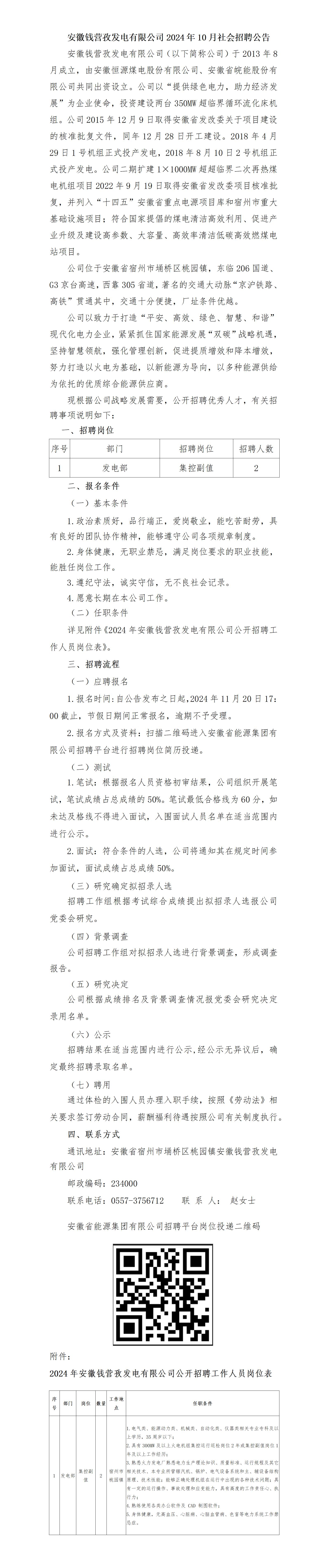 2024年宿州安徽錢營孜發(fā)電有限公司社會招聘公告