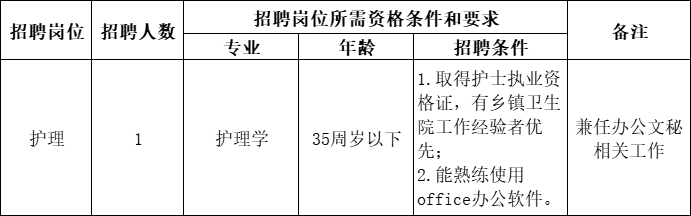 因工作需要,休寧縣萬安鎮(zhèn)衛(wèi)生院經研究決定通過黃山市仁和人力資源服務有限公司面向社會公開招聘護理人員1名,現(xiàn)將有關事項公告如下:
