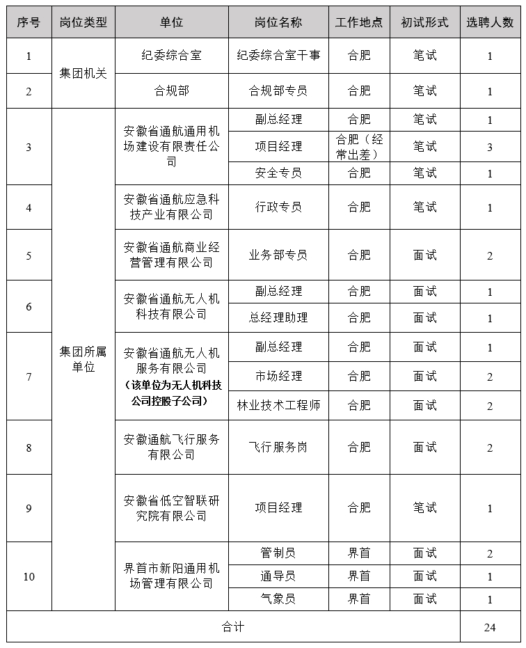 2025-04-30 17:31:07閱讀()安徽省人力資源有限公司安徽省通航控股集團有限公司是省屬一級大型通航國有企業(yè),承擔構建全省通用航空規(guī)劃建設、運營管理、產業(yè)發(fā)展和人才培養(yǎng)等戰(zhàn)略任務。目前,集團組建了通用機場建設、機場運營管理、低空飛行服務、無人機科技、航空應急科技、長三角快線、通航產業(yè)投資等子公司,建成通航飛行服務、無人機管理與服務、航空應急救援3大省級平臺,業(yè)務發(fā)展迅速,企業(yè)規(guī)模不斷擴大。