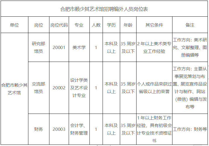 合肥市賴少其藝術(shù)館是合肥市委、市政府為建設(shè)文化強(qiáng)市,提高文化品位,收藏曾菲女士捐贈(zèng)的賴少其300件書畫珍品和寶貴史料,展示和弘揚(yáng)賴少其藝術(shù),投資新建的公益性文化設(shè)施,于2005年12月22日落成并對(duì)外免費(fèi)開放,隸屬于合肥市文化和旅游局。作為合肥市公益性文化事業(yè)單位和合肥市對(duì)外文化窗口,藝術(shù)館至今已13次入選文化和旅游部各類重點(diǎn)項(xiàng)目,其中連續(xù)7次入選“文化和旅游部全國(guó)美術(shù)館館藏精品展出季”項(xiàng)目,連續(xù)2次入選“文化和旅游部?jī)?nèi)地與港澳文化交流重點(diǎn)項(xiàng)目”,4次榮獲文化部獎(jiǎng)項(xiàng)。因工作需要,合肥市賴少其藝術(shù)館面向社會(huì)公開招聘3名工作人員。具體如下: