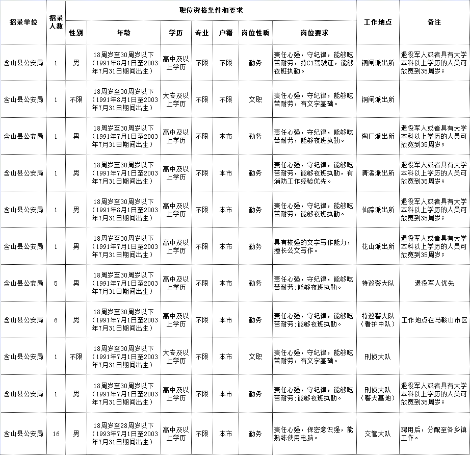 本次招聘警務(wù)輔助人員35名,具體職位見(jiàn)《馬鞍山市公安局含山片區(qū)招聘警務(wù)輔助人員職位表》(附件1)。