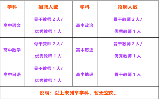 以上所有崗位均須大學(xué)本科及以上學(xué)歷,持有高中教師資格證且專業(yè)對口(研究生學(xué)歷者至少要求本科階段專業(yè)對口)。