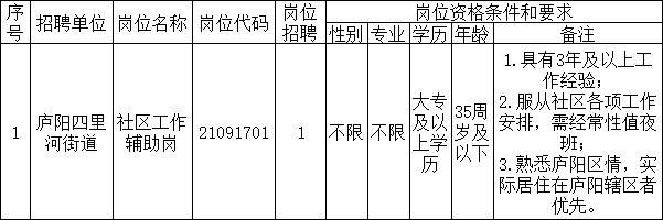 因工作需要,經(jīng)研究同意,委托遠創(chuàng)人力資源管理集團有限公司,公開招聘廬陽區(qū)四里河街道社區(qū)工作輔助崗人員1名?,F(xiàn)就有關事項公告如下: