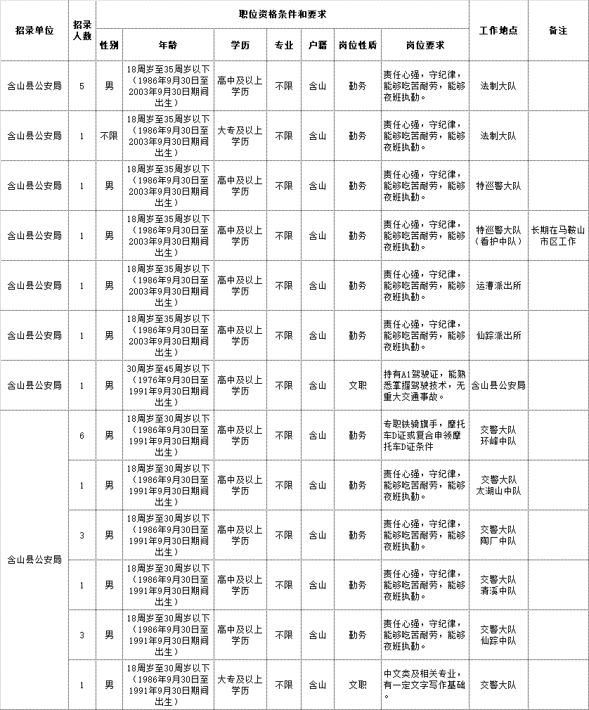 附件1:馬鞍山市公安局含山片區(qū)招聘警務(wù)輔助人員職位表