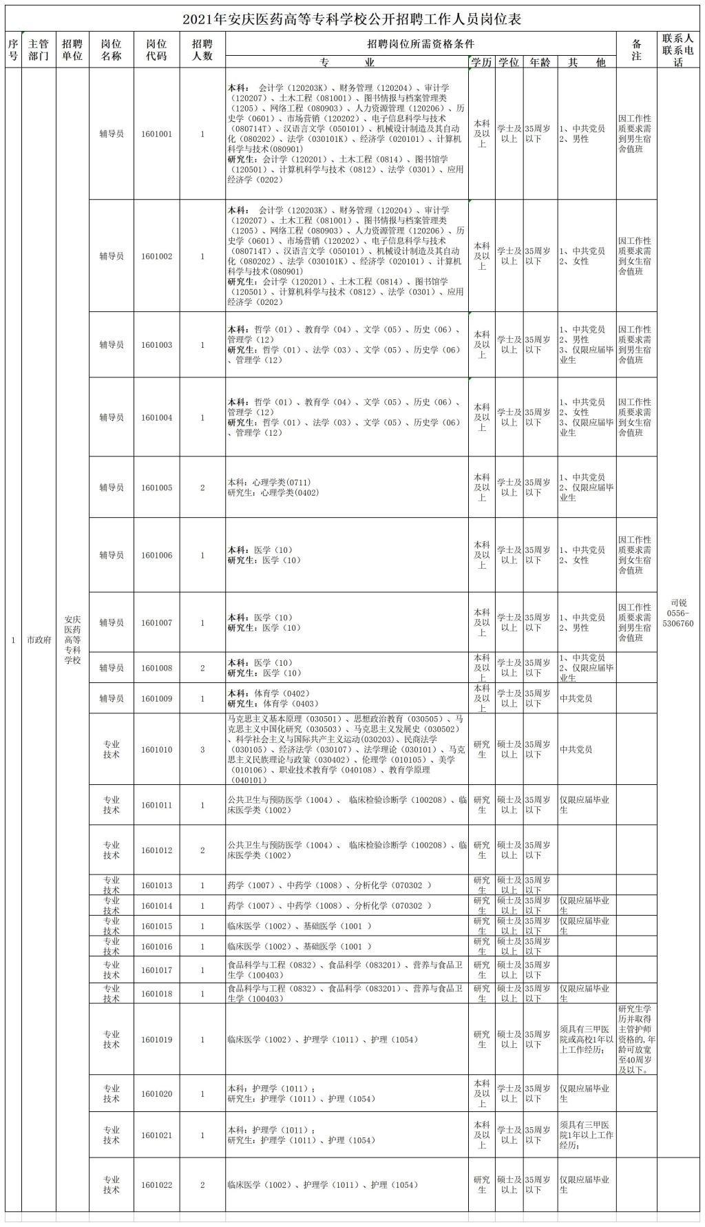 2021-10-15 17:02:17閱讀()安慶醫(yī)藥高等??茖W校根據《事業(yè)單位人事管理條例》(國務院令第652號),中共安徽省委組織部、安徽省人力資源和社會保障廳《關于印發(fā)〈安徽省事業(yè)單位公開招聘人員暫行辦法〉的通知》(皖人社發(fā)〔2010〕78號)和中共安徽省委組織部、安徽省人力資源和社會保障廳《關于貫徹落實應對新冠肺炎疫情影響做好事業(yè)單位公開招聘高校畢業(yè)生工作有關事項的通知》(皖人社秘〔2020〕73號)規(guī)定和要求,現就2021年安慶醫(yī)藥高等??茖W校公開招聘工作人員有關事項公告如下: