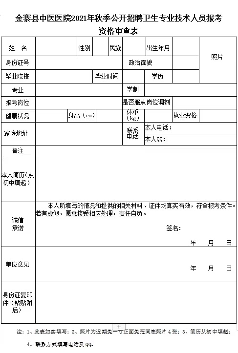 3、網(wǎng)上報(bào)名者可在金寨縣中醫(yī)醫(yī)院網(wǎng)站上下載《金寨縣中醫(yī)醫(yī)院2021年秋季公開招聘衛(wèi)生專業(yè)技術(shù)人員報(bào)考資格審查表》(如實(shí)填寫健康狀況及身高體重),將填寫完整的報(bào)考資格審查表、近期一寸正面免冠同底照片及報(bào)名所需材料的掃描件或清晰照片以附件的形式上傳。在發(fā)送郵件“主題”中注明真實(shí)姓名+專業(yè)+報(bào)考崗位,每位報(bào)考者限報(bào)1個(gè)崗位,須使用統(tǒng)一有效居民身份證參加報(bào)名和考試(如未按要求提交報(bào)名材料或上傳材料不全視為報(bào)名無效,無考試資格,不再另行通知)。請(qǐng)報(bào)考人員在報(bào)名審核表上準(zhǔn)確填寫聯(lián)系電話和地址,如有變化請(qǐng)及時(shí)告知。