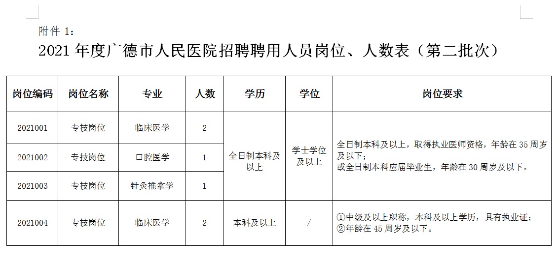 詳見《2021年度廣德市人民醫(yī)院招聘聘用人員(第二批次)崗位計(jì)劃、條件一覽表 》(附件1)。