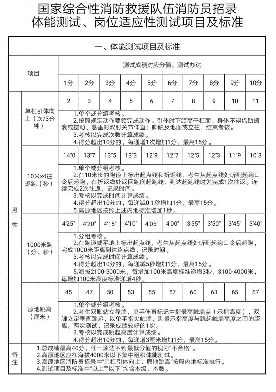 4、體檢。體檢費用自理。體檢標準參照《應征公民體格檢查標準》中軍隊陸勤人員標準執(zhí)行?;谙谰仍ぷ鲝姸蕊L險高的特殊要求,對已評定殘疾等級和有嚴重傷病治療記錄等不適宜從事消防救援工作的不予招錄。