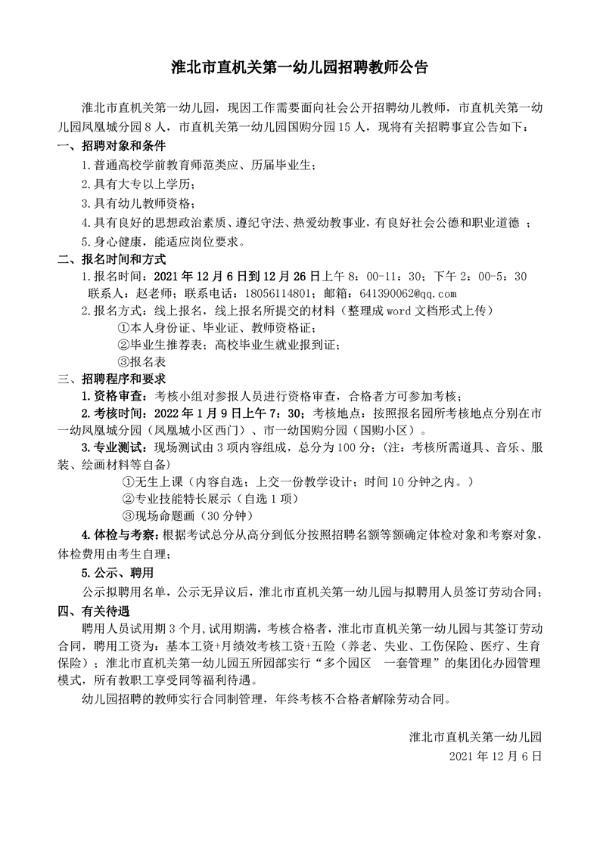 2021年淮北市直機關(guān)第一幼兒園招聘教師公告
