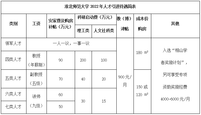2. 四類至七類人才:引進(jìn)的四類至七類人才享受《淮北師范大學(xué)人才引進(jìn)待遇簡表》中相應(yīng)的安家費(fèi)及購房補(bǔ)貼、科研啟動費(fèi)、教授(博士)津貼、成本價購房等待遇;其配偶具有學(xué)士及以上學(xué)位,可在校內(nèi)安排工作。同時,聘期(6年)內(nèi)入選“相山學(xué)者獎勵計(jì)劃”,另可享受專項(xiàng)資助獎勵經(jīng)費(fèi)4000-6000元/月。引進(jìn)人才的具體聘期任務(wù)及待遇以雙方合同約定為準(zhǔn)(教育部重點(diǎn)實(shí)驗(yàn)室聘用人才的待遇另行約定)。