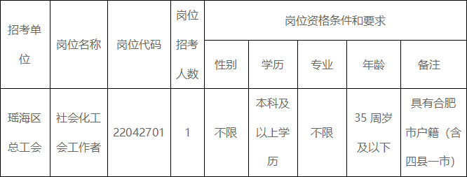 結(jié)合實(shí)際工作需要,經(jīng)研究決定,瑤海區(qū)總工會2022年面向合肥市公開招聘社會化工會工作者1名,現(xiàn)將有關(guān)事項(xiàng)公告如下: