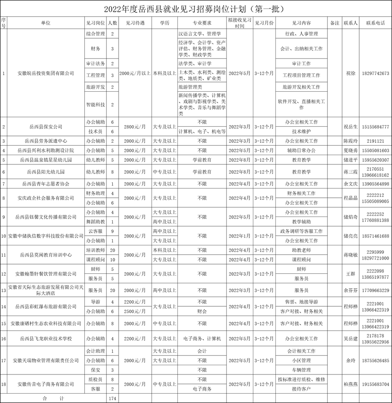 2022年5月前已征集第一批崗位174個(gè),具體崗位情況、招聘條件、見習(xí)待遇及見習(xí)內(nèi)容等見附件《2022年度岳西縣就業(yè)見習(xí)招募崗位計(jì)劃(第一批)》。